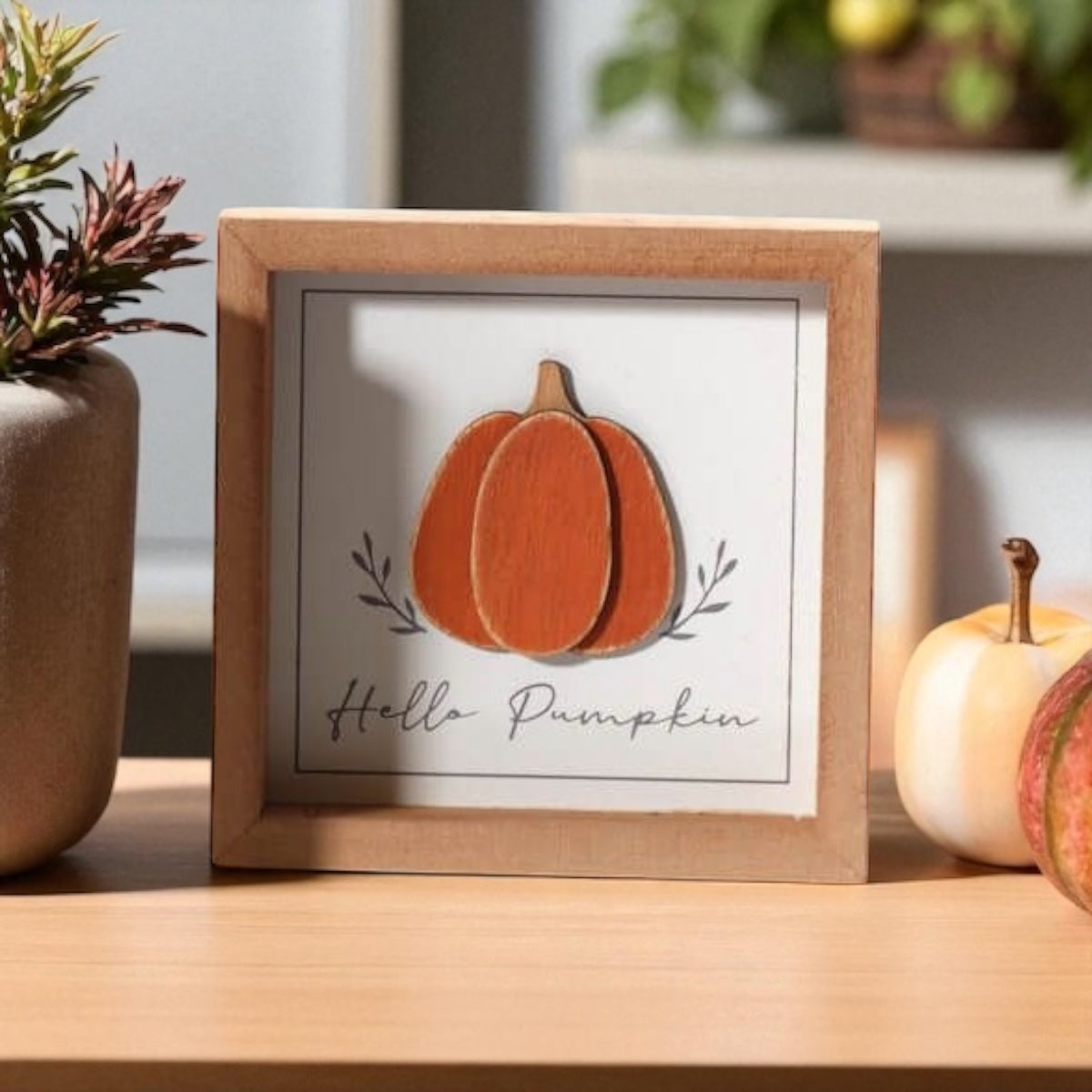12cm x 12cm x 2.3cm wood framed plaques, each with a raised pumpkin design in orange or green, featuring seasonal phrases and a natural wood frame. Choose which design you would like from