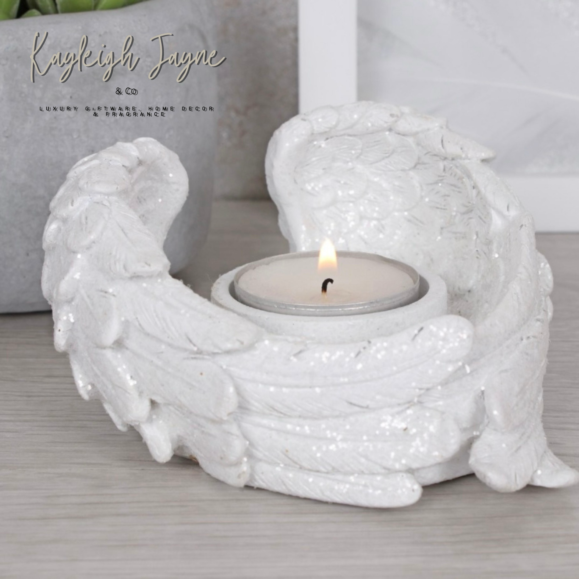A beautiful candle holder for tealights or small votives. This pair of angel wings is dusted in clear glitter flakes which give a gorgeous sparkly finish when caught in the candlelight.