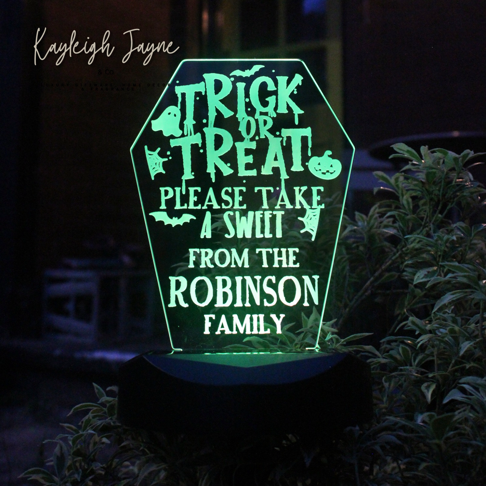 This spooky personalised Trick or Treat solar light is the ideal Halloween decoration!