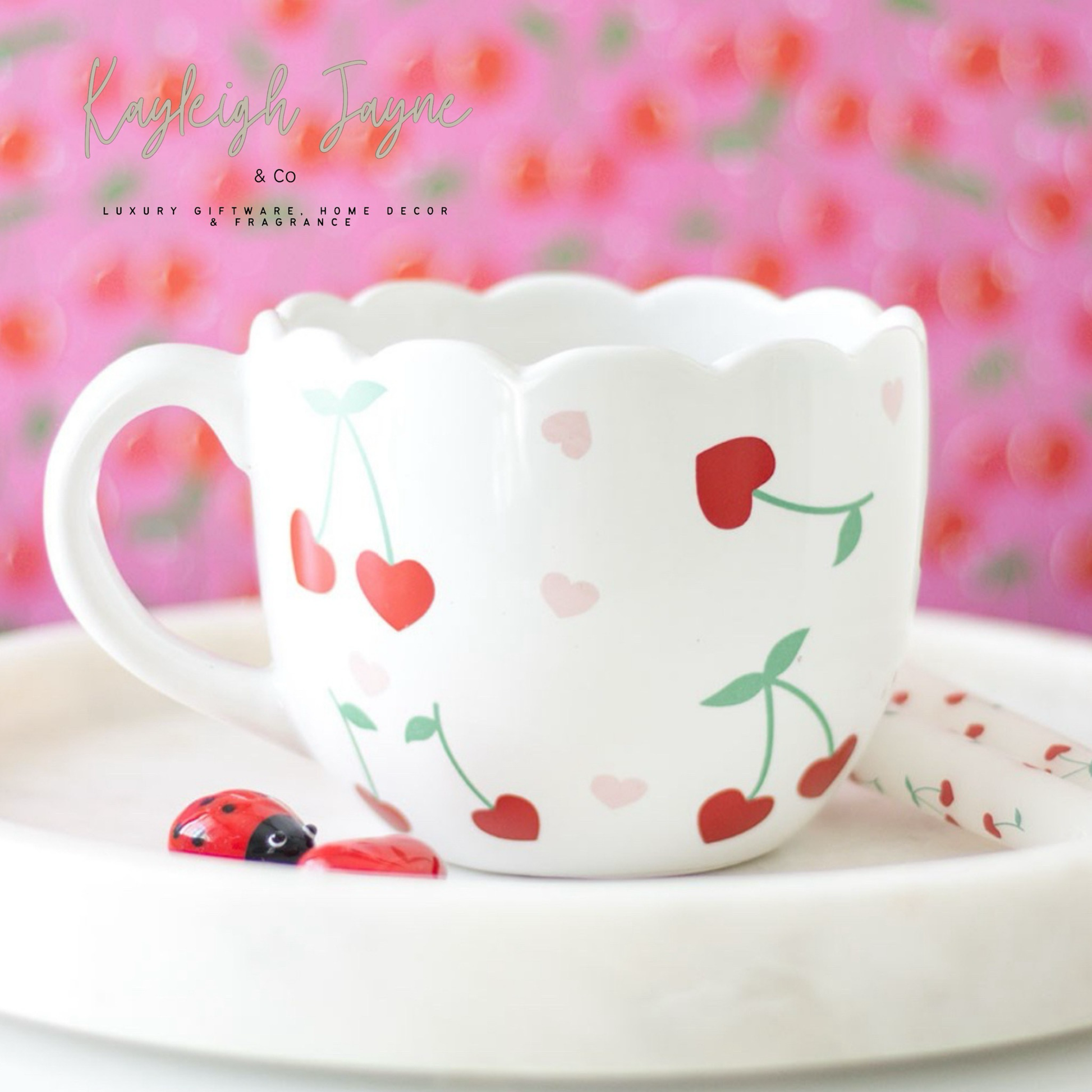 Bring a touch of sweetness to your tea break with this adorable mug, featuring a playful cherry heart design. The mug is framed by a beautifully scalloped rim for adding elegance to any mug collection. 480ml. Do not microwave. Handwash only.