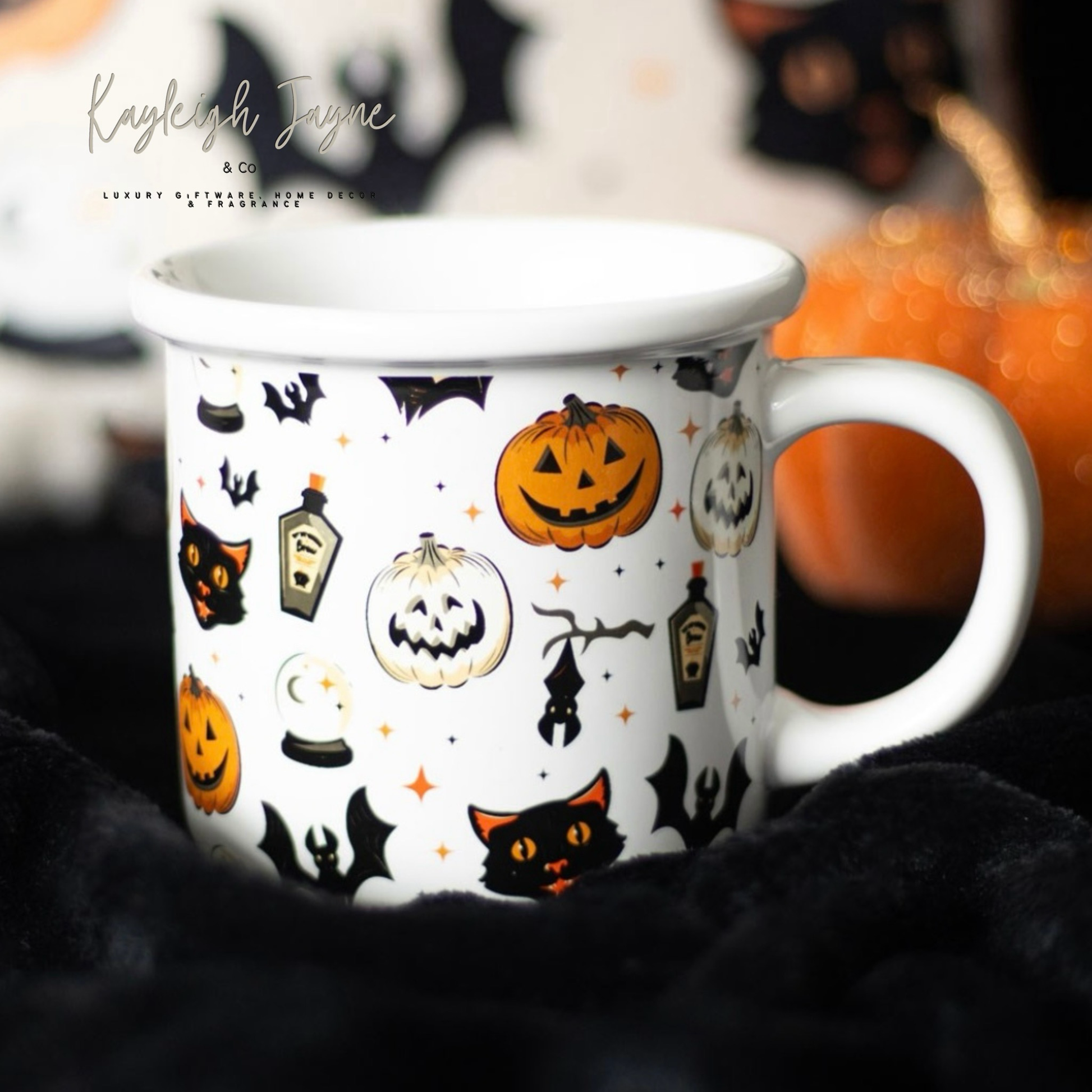 Get in the spirit of Halloween with this chunky ceramic mug featuring vintage inspired Halloween motifs like black cats, bats, potion bottles and jack-o'- lanterns. 480ml. Microwave safe.