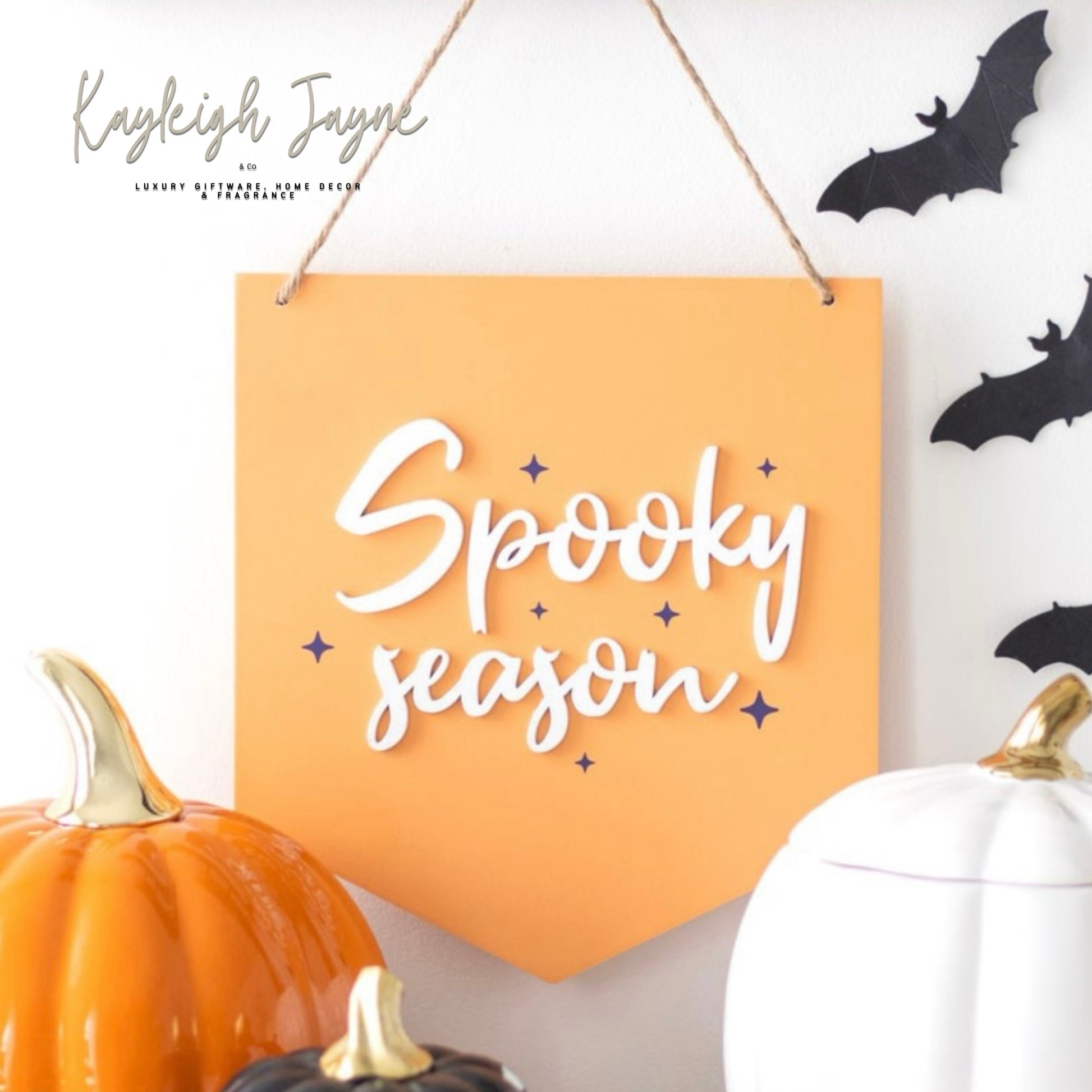 Decorate for Halloween with this 'Spooky Season' orange hanging sign. Designed in a pastel orange, it's perfect for more subtle styling for the season and can be dressed up by adding cobwebs or plastic spiders to the hanging string for more impact.