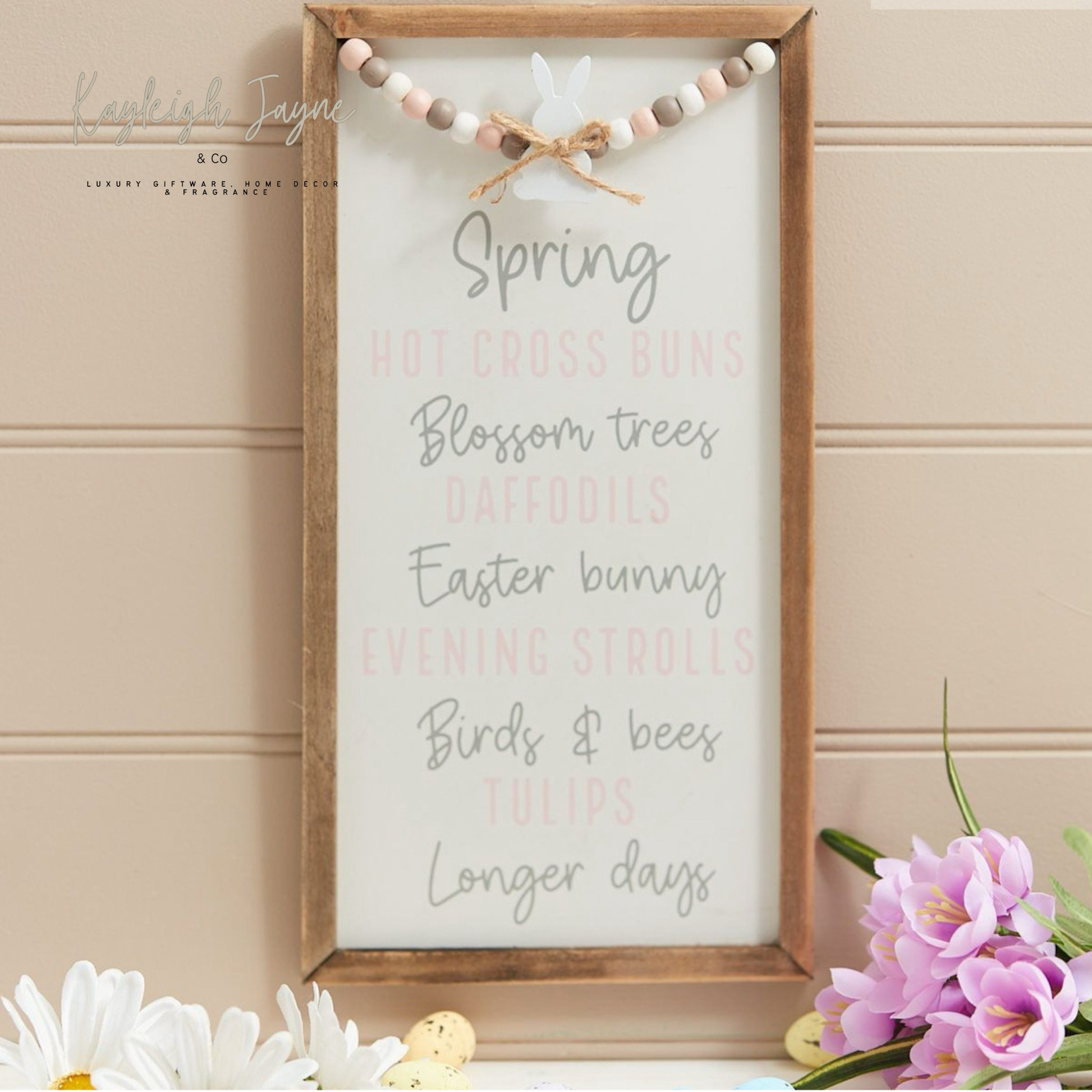 Bring the charm of spring indoors with this sweet wooden sign. Featuring soft pastels, a rustic bead garland, and a cute little bunny detail, it’s the perfect nod to the season. With phrases like Hot Cross Buns, Easter Bunny, and Blossom Trees, it’s a gentle reminder of all the things we love about springtime.