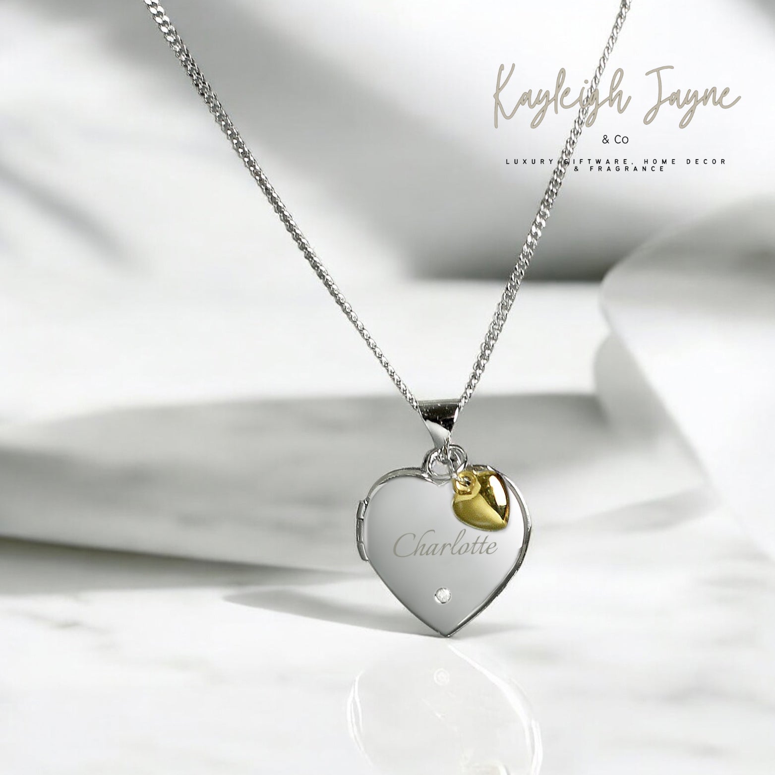 This Personalised Sterling Silver & Gold Plated Heart Locket Necklace, features a small inset diamond, making it a striking piece of jewellery.