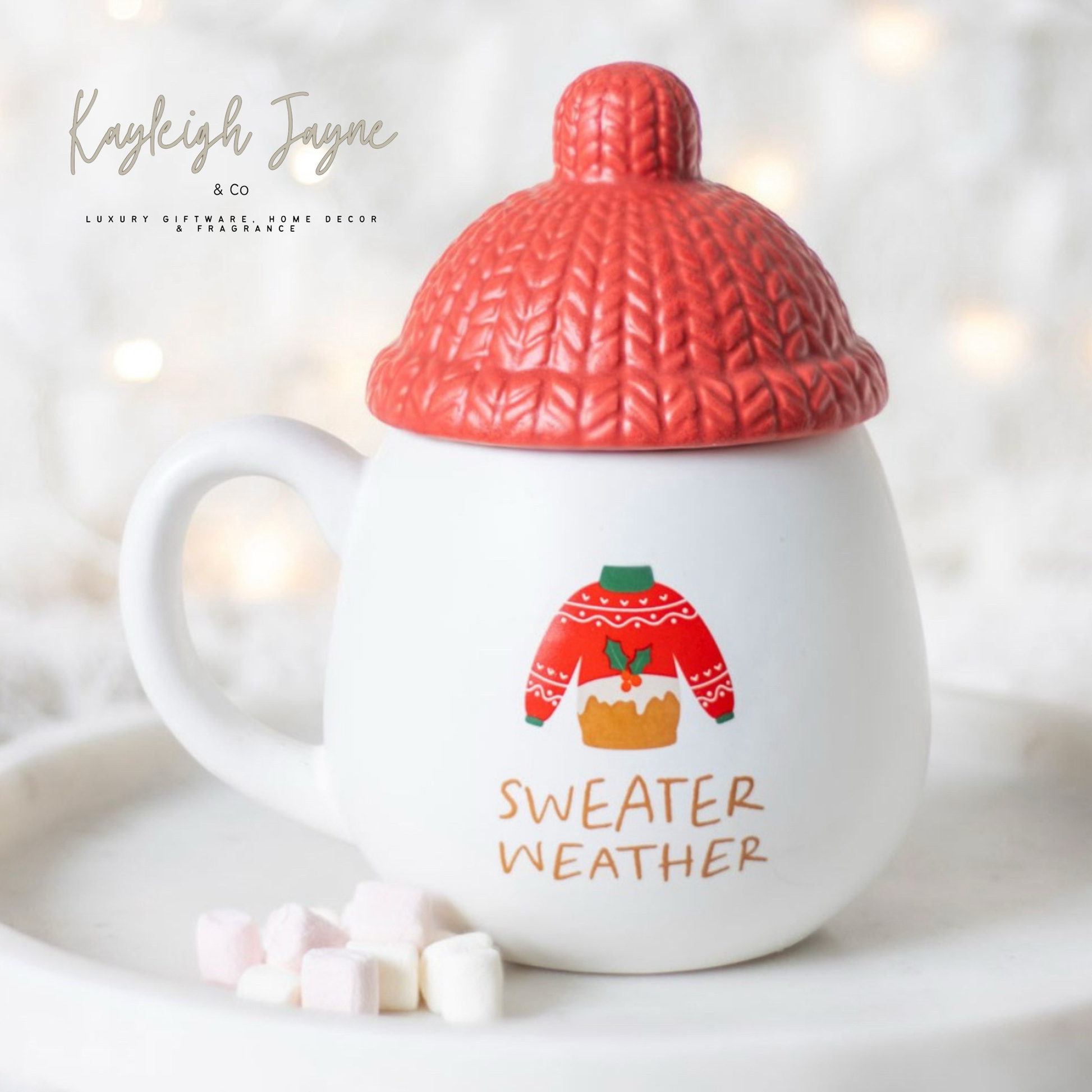 Embrace winter season with open arms with this novelty 'Sweater Weather' mug, complete with a red bobble hat lid. Whether it's for sipping a cosy gingerbread latte or a warming hot chocolate, this fun mug is a perfect fit for anyone who wears their love for Christmas on their sleeve! Not suitable for microwave use. Handwash only. 480ml