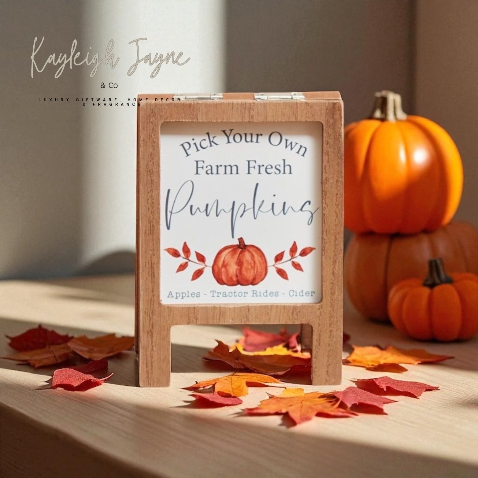 A-frame plaques made of light brown wood, each featuring a white sign with pumpkin-themed fall graphics and text. Designs include phrases such as "Pick Your Own Farm Fresh Pumpkins" and "Welcome to the Pumpkin Cafe," both decorated with orange pumpkin illustrations. Each plaque is hinged at the top.